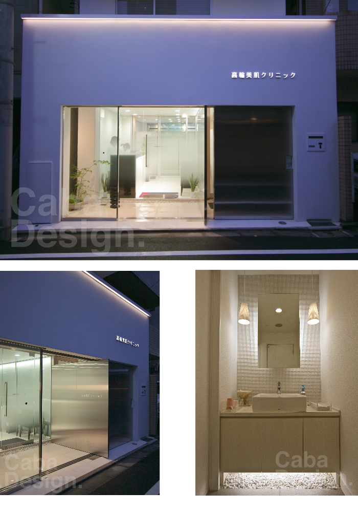 口コミや紹介で来院する方々が絶えない形成外科クリニックです。改装の目的は、老朽化とファサードの視認性を良くすることでした。足を運ぶ患者さんのほとんどが、入口と気づかずに通り過ぎる現状 (=Before)から、遠くからでも目立つ(=After) デザインを提案。シミひとつないすべすべとしたテクスチャーと、院長先生の技術力の高さを表現したラボのイメージをあわせたデザインは、入口そのものが先生の方針を表す「看板」となっています。